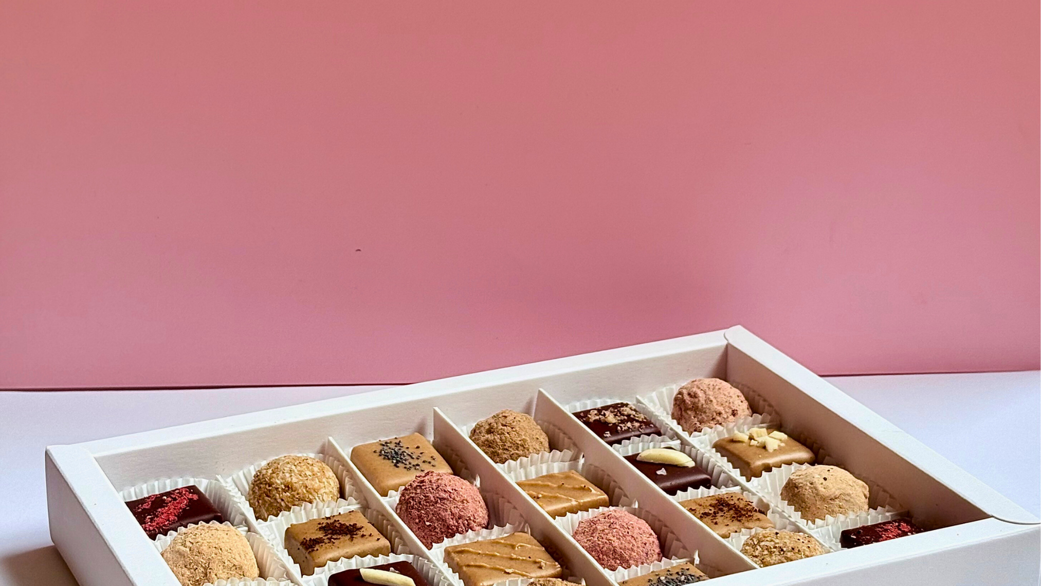 Unwiderstehlich lecker. Cremige Füllungen mit dunkler Schok*lade überzogen. Nur mit Erdmandeln, Yacon und Datteln gesüßt.